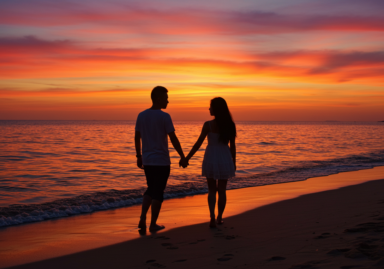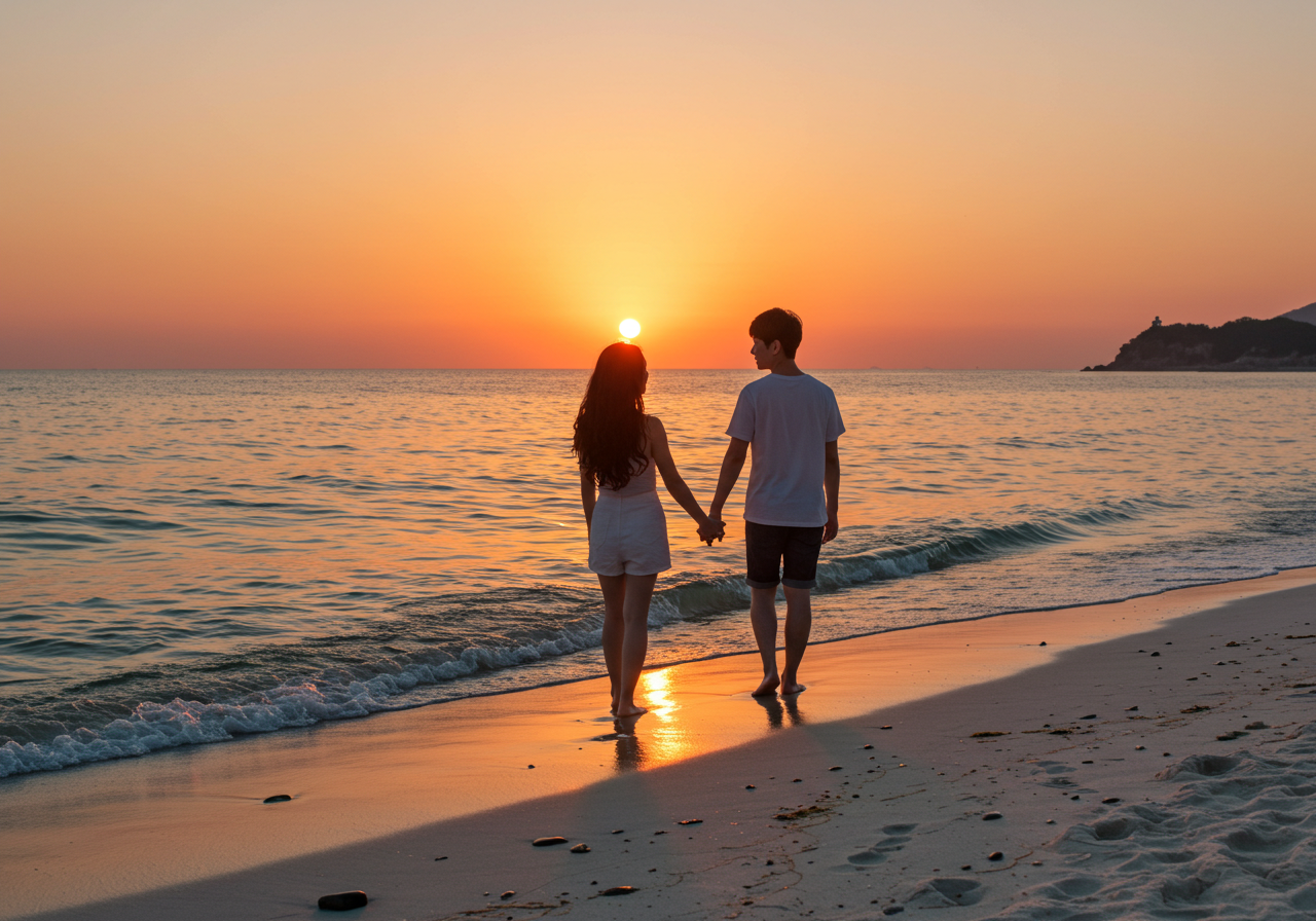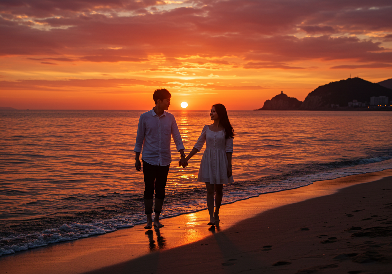 - 만리포 해수욕장에서 일몰을 감상하는 커플, 알뜰 국내 여름휴가 추천