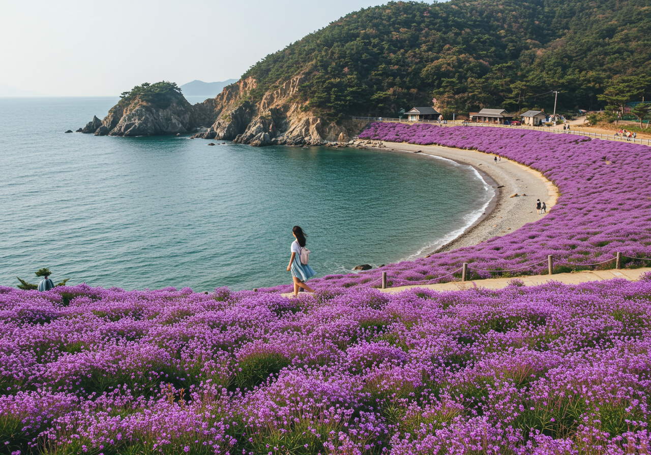 안좌면의 반월도와 박지도는 '퍼플섬'이라는 이색적인 테마로 관광객들의 발길을 이끌고 있습니다. 섬 전체가 보라색으로 꾸며져 있어 이국적인 풍경을 자랑하며, 곳곳이 포토존이라 인생샷을 남기기 좋습니다. 섬 내에는 보라색 옷을 입고 오면 입장료가 무료인 곳도 있어 '가성비 국내 여름휴가'를 계획하는 분들에게 더욱 매력적입니다. 섬과 섬을 잇는 목교를 걸으며 서해의 푸른 바다와 보라색 풍경이 어우러진 그림 같은 풍경을 만끽할 수 있습니다.