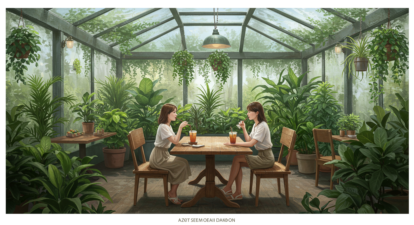 - 이미지 대체 텍스트 예시: 싱그러운 식물들로 가득한 식물원 카페 내부 (도심 속 피서지, 카페)