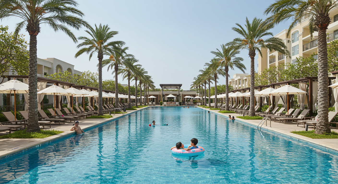 - 이미지 대체 텍스트 예시: 고급 리조트 수영장에서 여름휴가를 즐기는 가족.