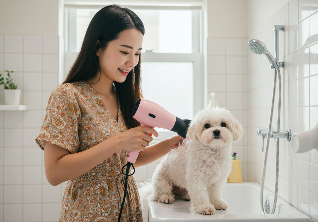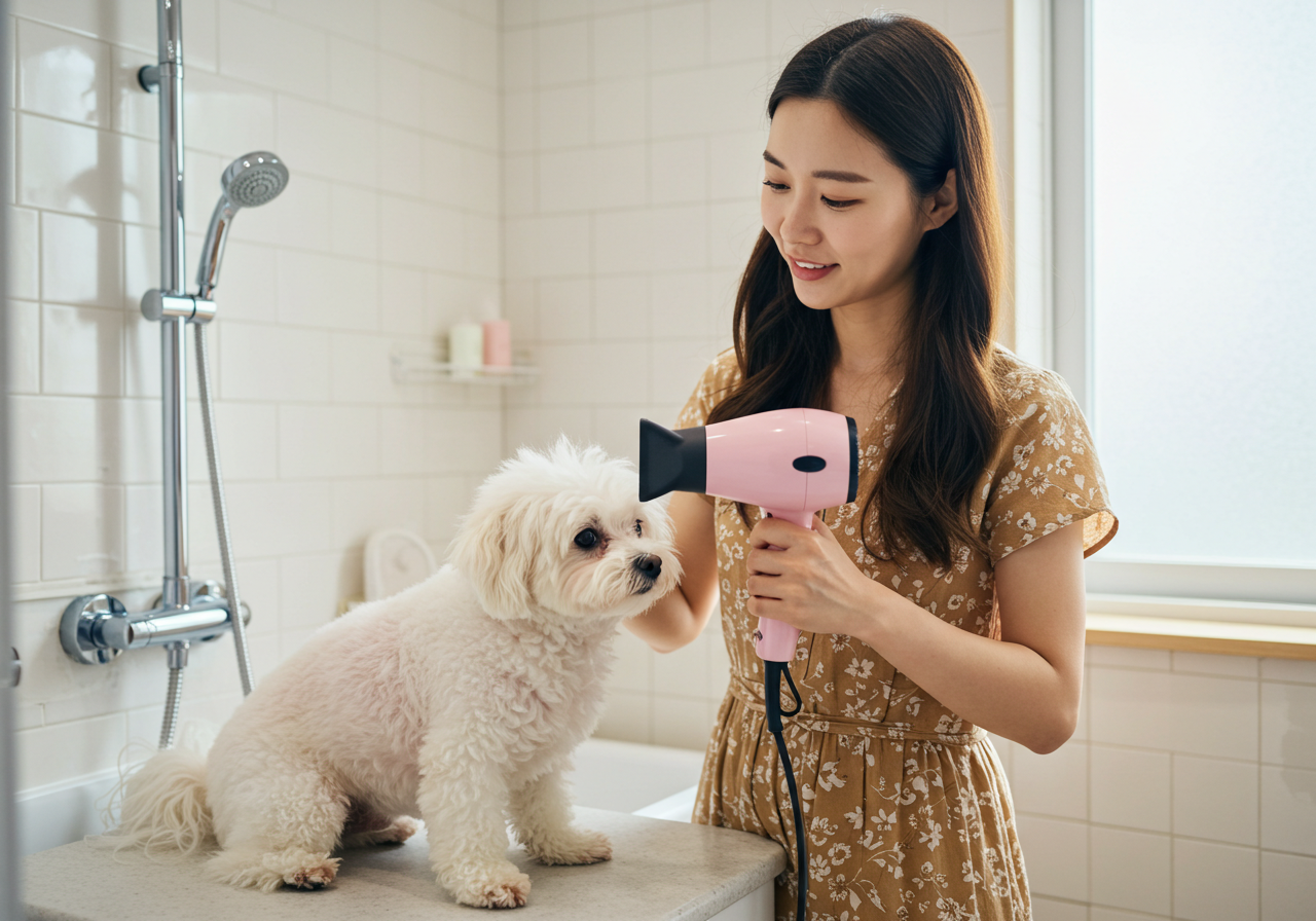 - 이미지 대체 텍스트 예시: 보호자가 드라이기로 강아지의 털을 꼼꼼하게 말려주고 있는 모습. (강아지 여름철 미용, 피부 관리)