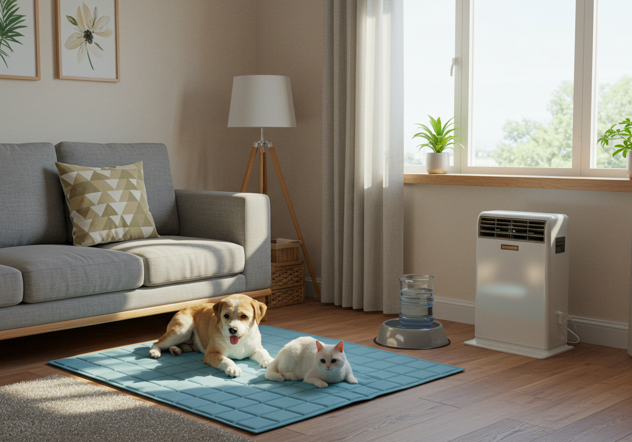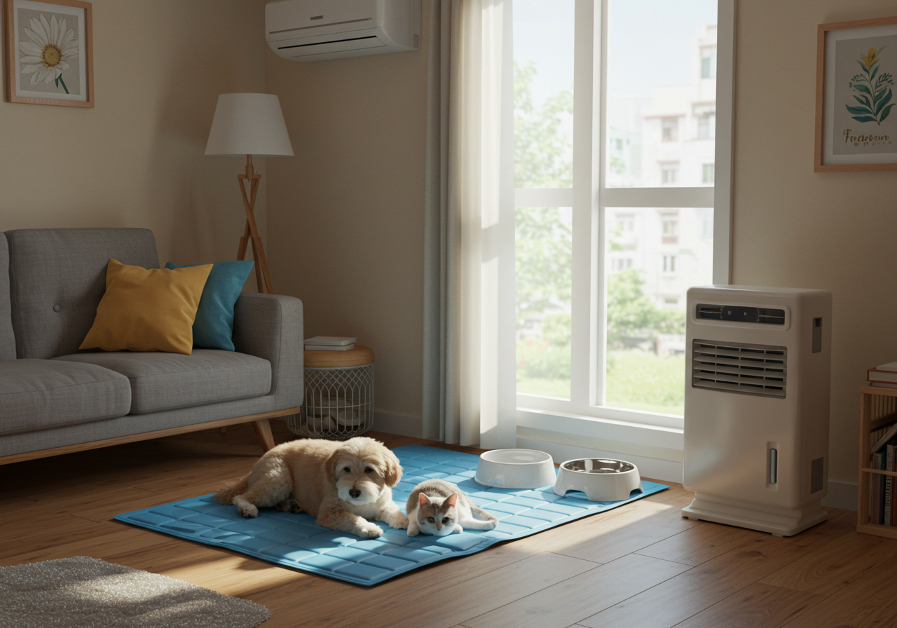 - 이미지 대체 텍스트 예시: 시원한 거실에서 쿨매트 위에 누워 편안하게 쉬고 있는 강아지와 옆에서 에어컨을 조절하는 보호자의 모습. (여름철 반려동물 시원한 공간, 에어컨 사용법)
