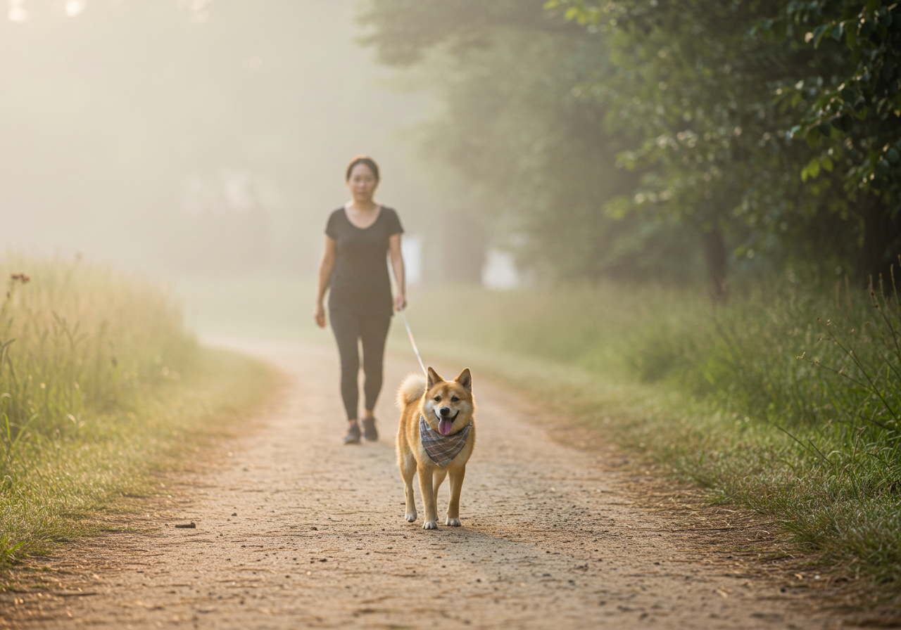 - 이미지 대체 텍스트 예시: 이른 아침 공원에서 시원한 흙길을 산책하는 강아지와 보호자의 모습. (여름철 강아지 산책, 발바닥 보호)
