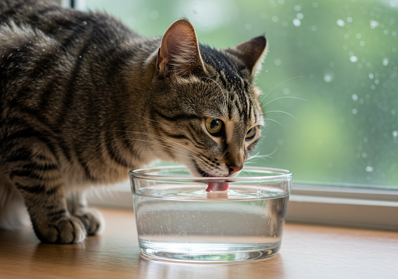 - 이미지 대체 텍스트 예시: 투명한 물그릇에 깨끗한 물이 가득 담겨 있고, 고양이가 물을 마시고 있는 모습. (반려동물 수분 섭취, 깨끗한 물)