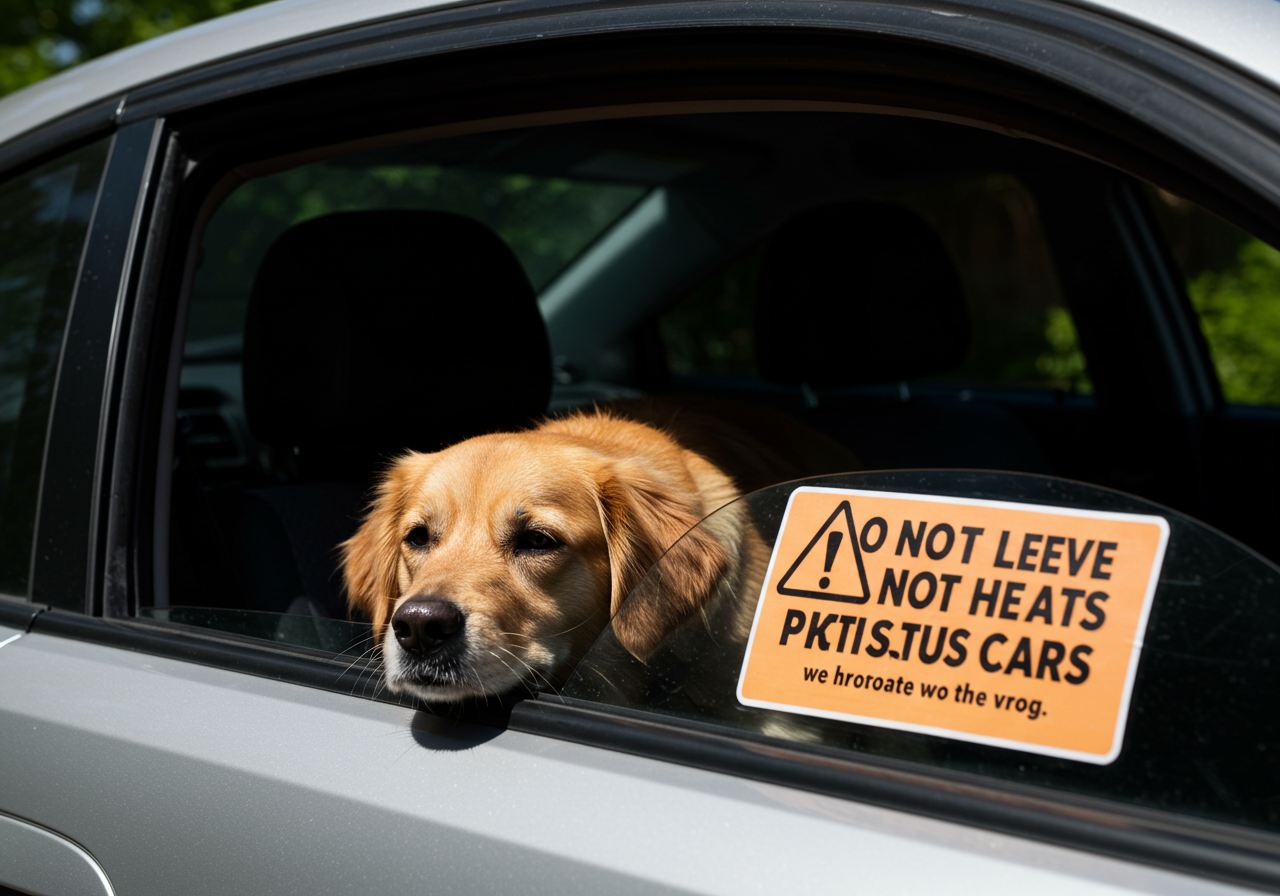 - 이미지 대체 텍스트 예시: 차 안에 방치되어 힘들어하는 강아지의 모습과 그 옆에 '반려동물을 차에 홀로 두지 마세요'라고 적힌 경고문. (여름철 반려동물 열사병, 차량 방치 위험)