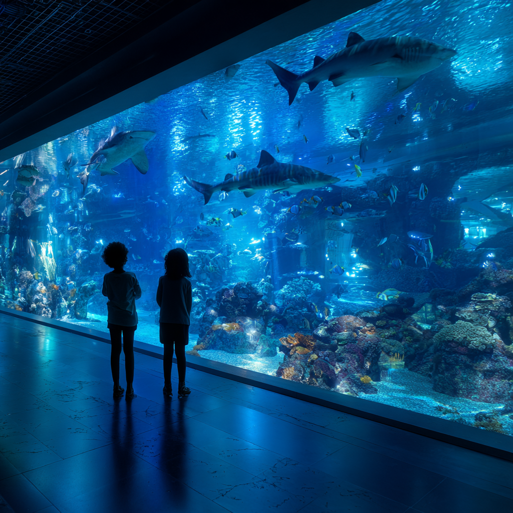 [이미지 대체 텍스트 예시: 아쿠아리움 대형 수조 앞에서 아이들이 상어와 열대어를 보며 신기해하는 모습]