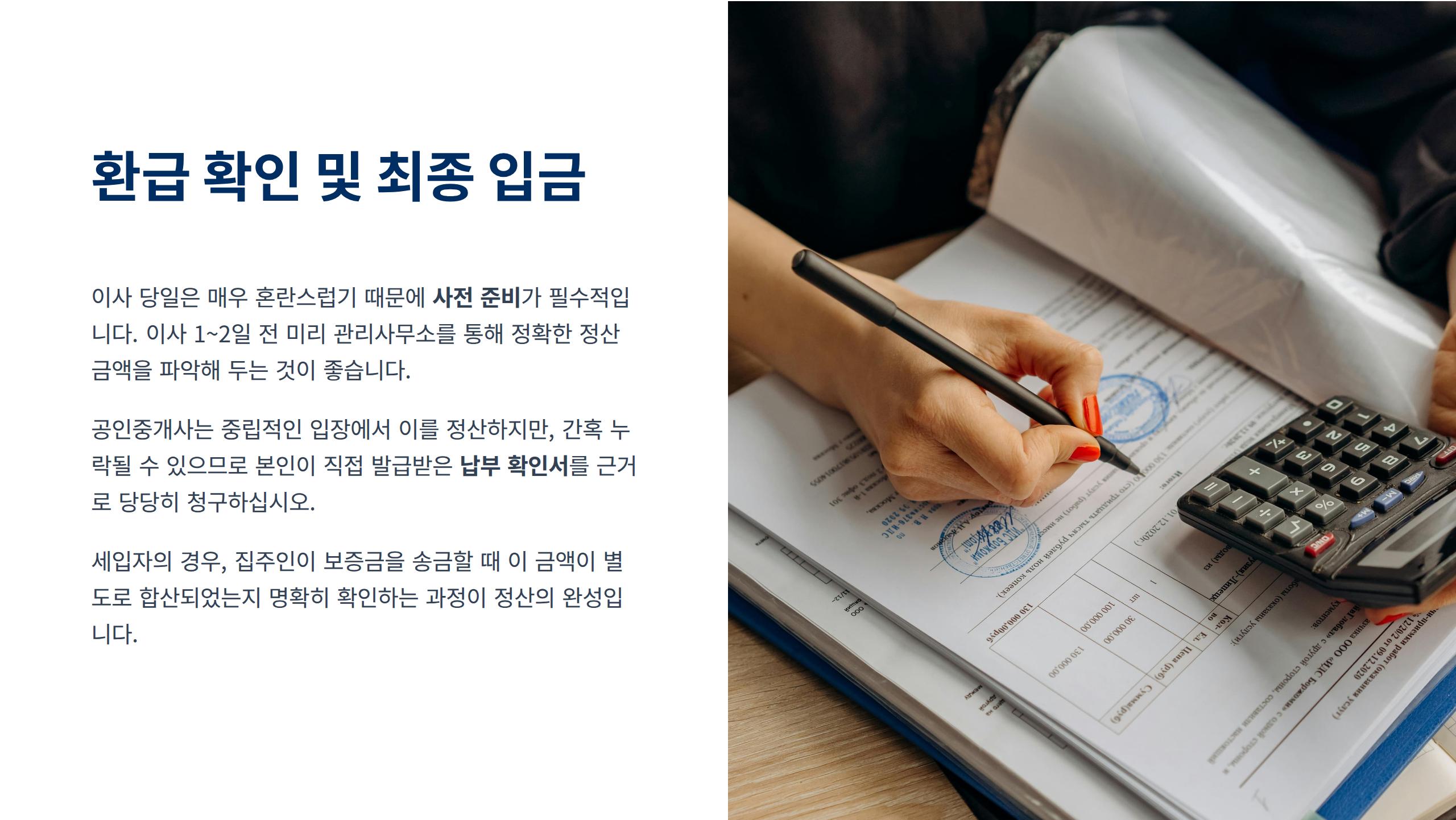 집주인으로부터 보증금과 함께 장기수선충당금 합계액이 들어왔는지 최종 확인하면 끝납니다.