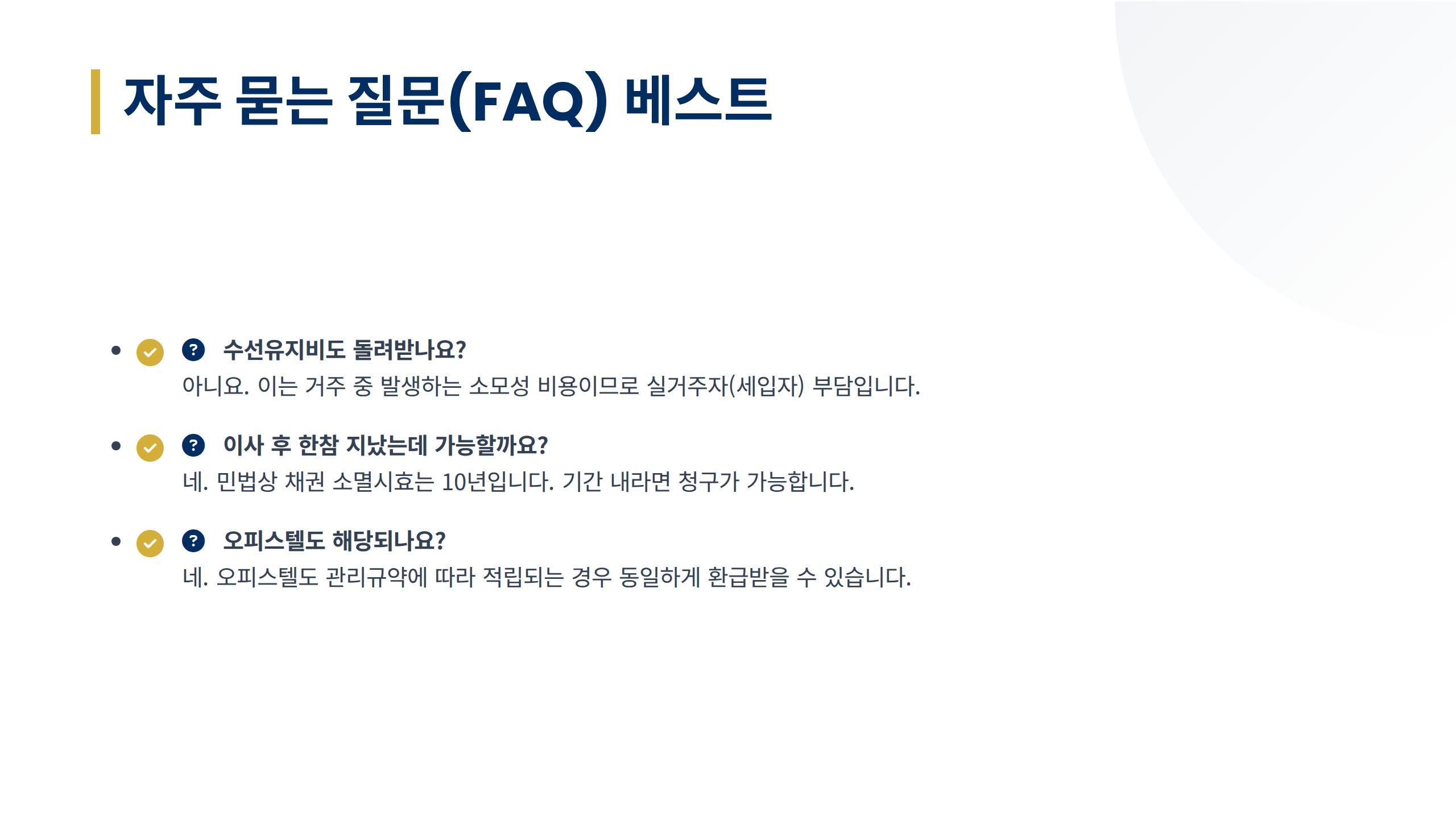 주의해야 할 점은 수선유지비입니다. 이는 공동시설의 소모성 비용(전구 교체, 청소 등)으로, 실제 거주하며 혜택을 보는 세입자가 부담하는 비용이므로 환급 대상이 아닙니다.