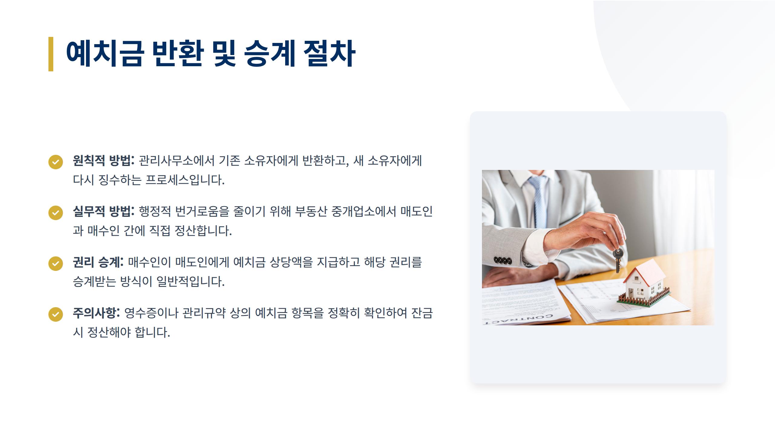 원칙적으로는 관리사무소에서 반환받아야 하지만, 실제 부동산 거래 현장에서는 매도인과 매수인 간에 정산하는 것이 관례입니다. 매수인이 매도인에게 해당 금액을 지급하고, 관리비 예치금에 대한 권리를 승계받는 방식입니다.