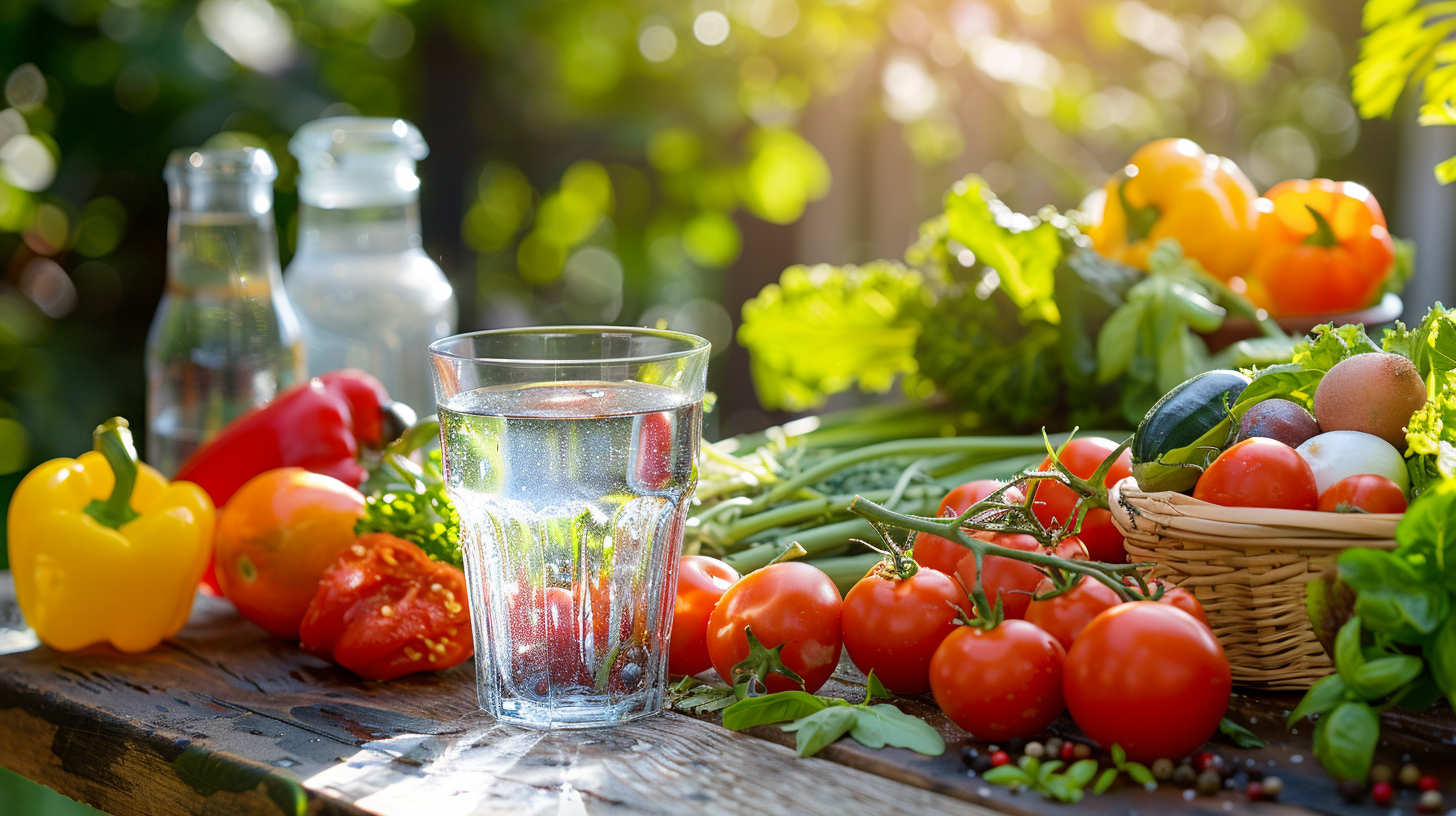 이미지 대체 텍스트 예시: 신선한 채소와 과일, 그리고 물 한 잔이 놓여 있는 식탁.