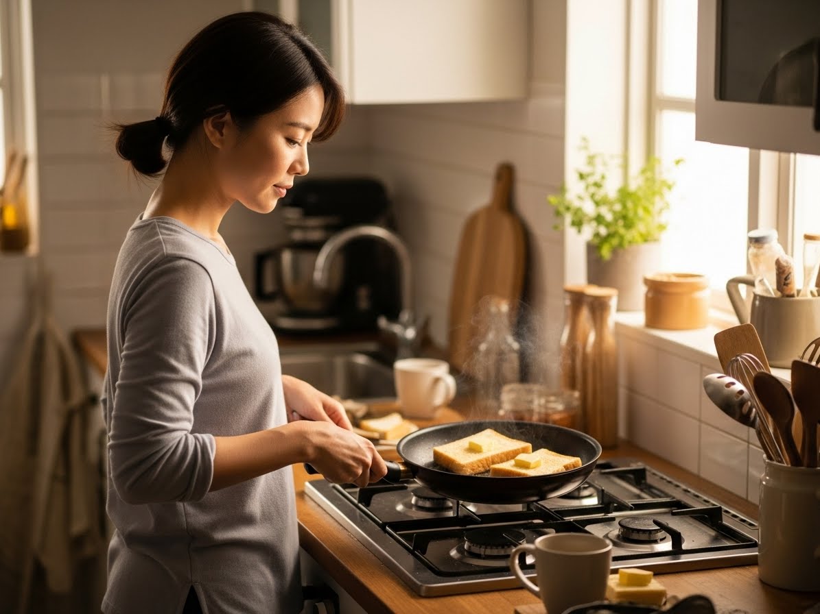 먼저 팬에 버터를 조금 녹인 뒤 빵을 앞뒤로 노릇하게 구워주세요. 그냥 굽는 것보다 버터를 조금 더하면 풍미가 확 살아나서 훨씬 맛있어지더라고요.