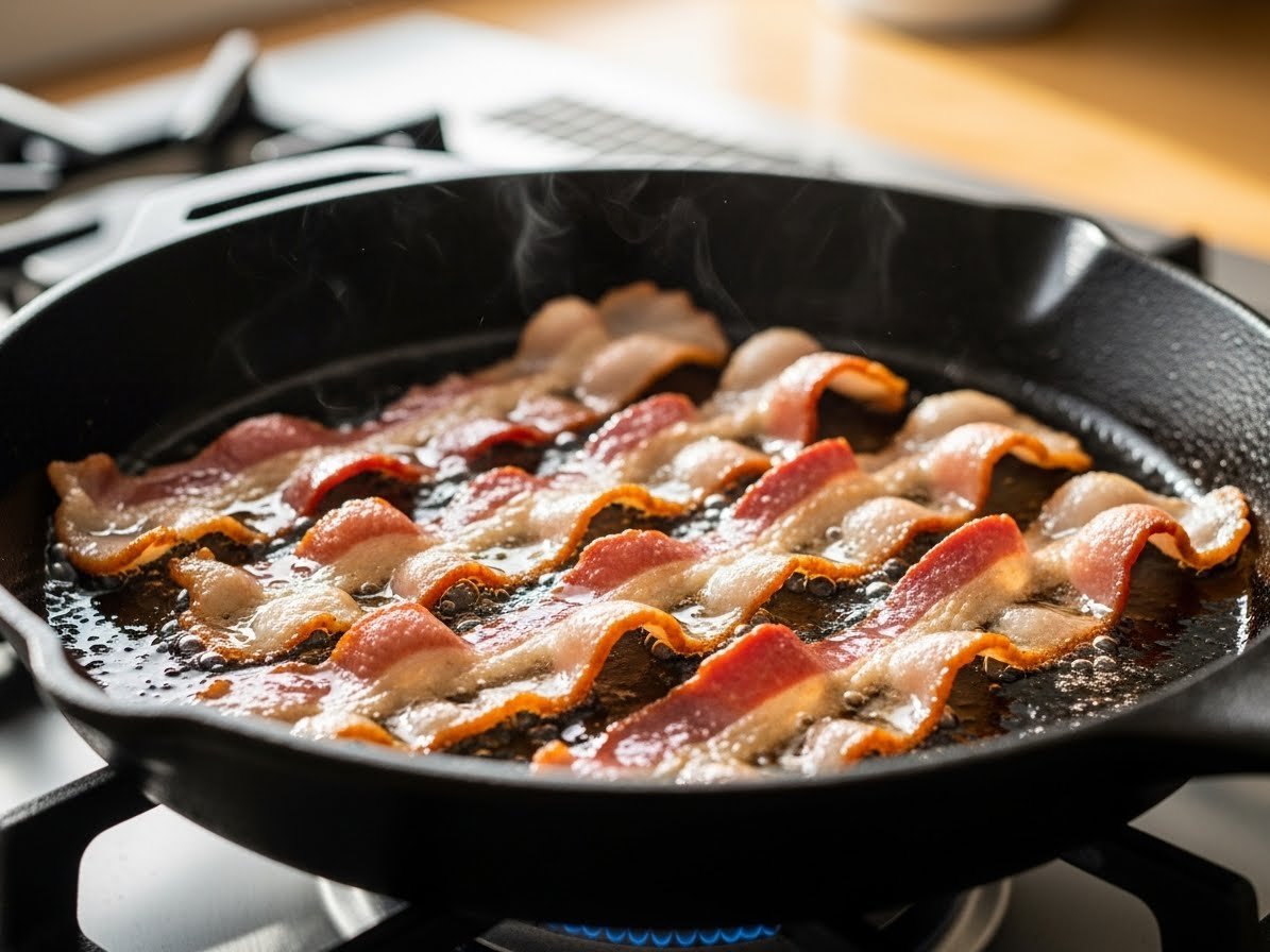 베이컨은 별다른 기름 없이 그대로 굽는 게 포인트예요. 중불에서 서서히 익히면 기름이 자연스럽게 나오면서 바삭하고 고소한 식감이 살아나요.