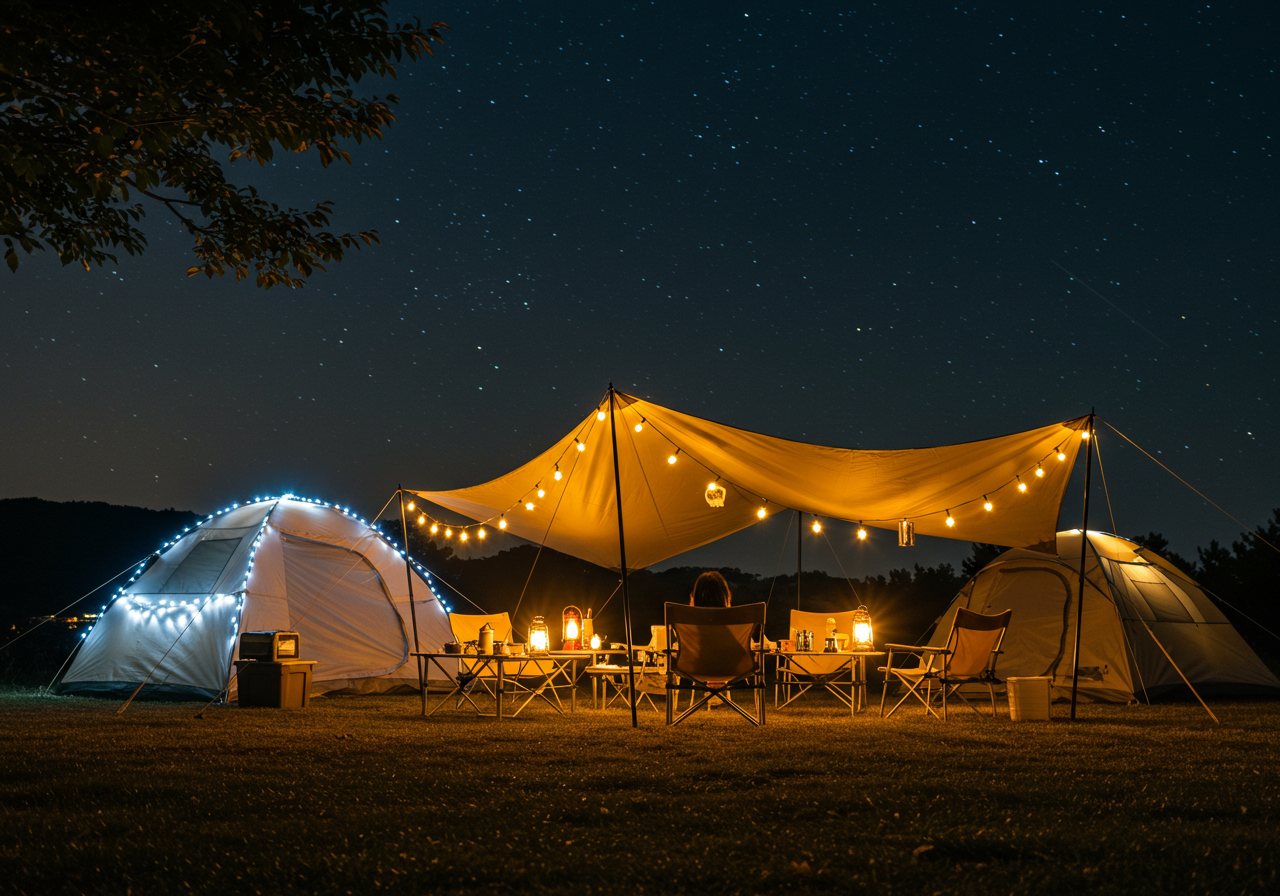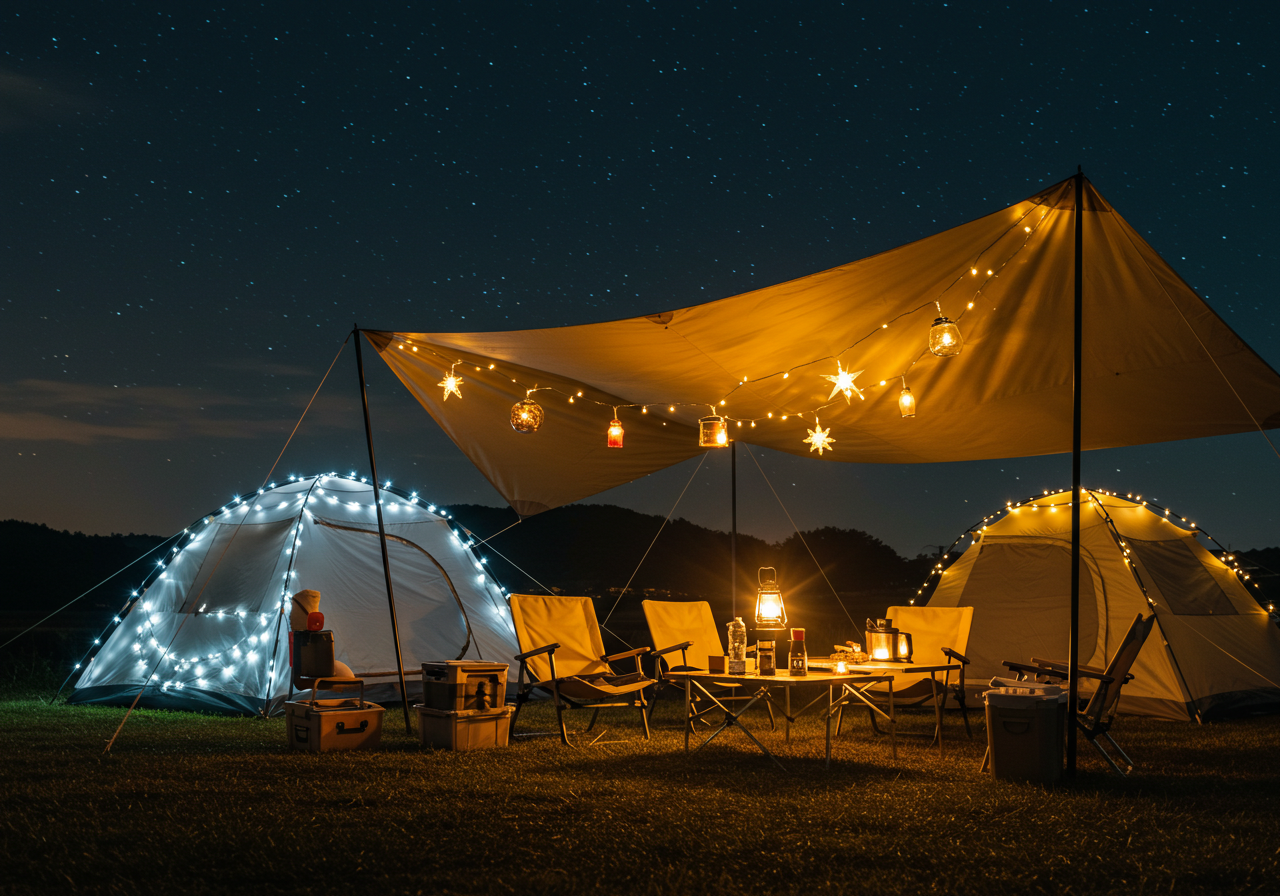 - LED 스트링 라이트 & 가랜드: 텐트나 타프 주변에 따뜻한 색감의 LED 스트링 라이트를 걸어두면 아늑하고 로맨틱한 분위기를 연출할 수 있습니다. 개성 있는 디자인의 가랜드를 함께 활용하는 것도 좋습니다.