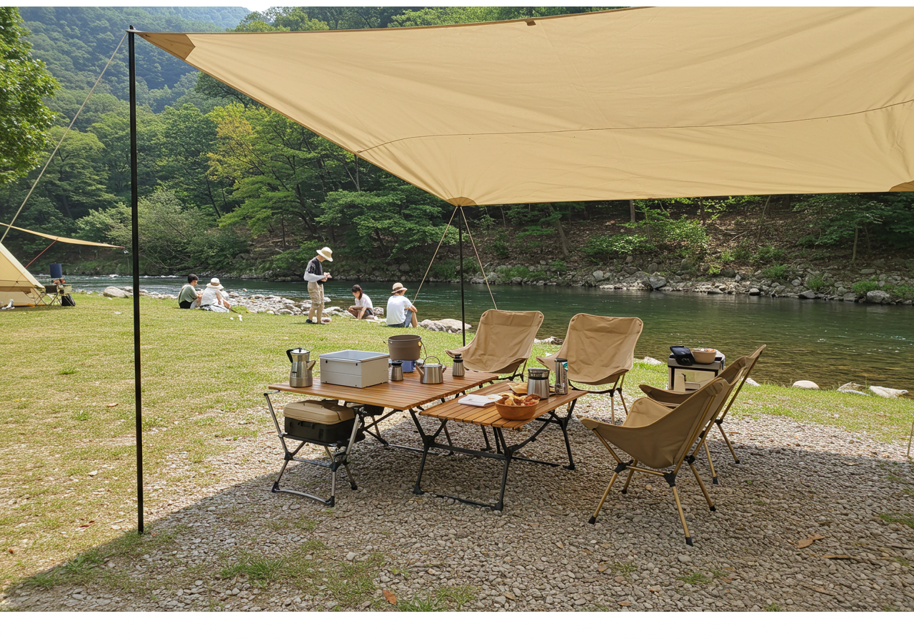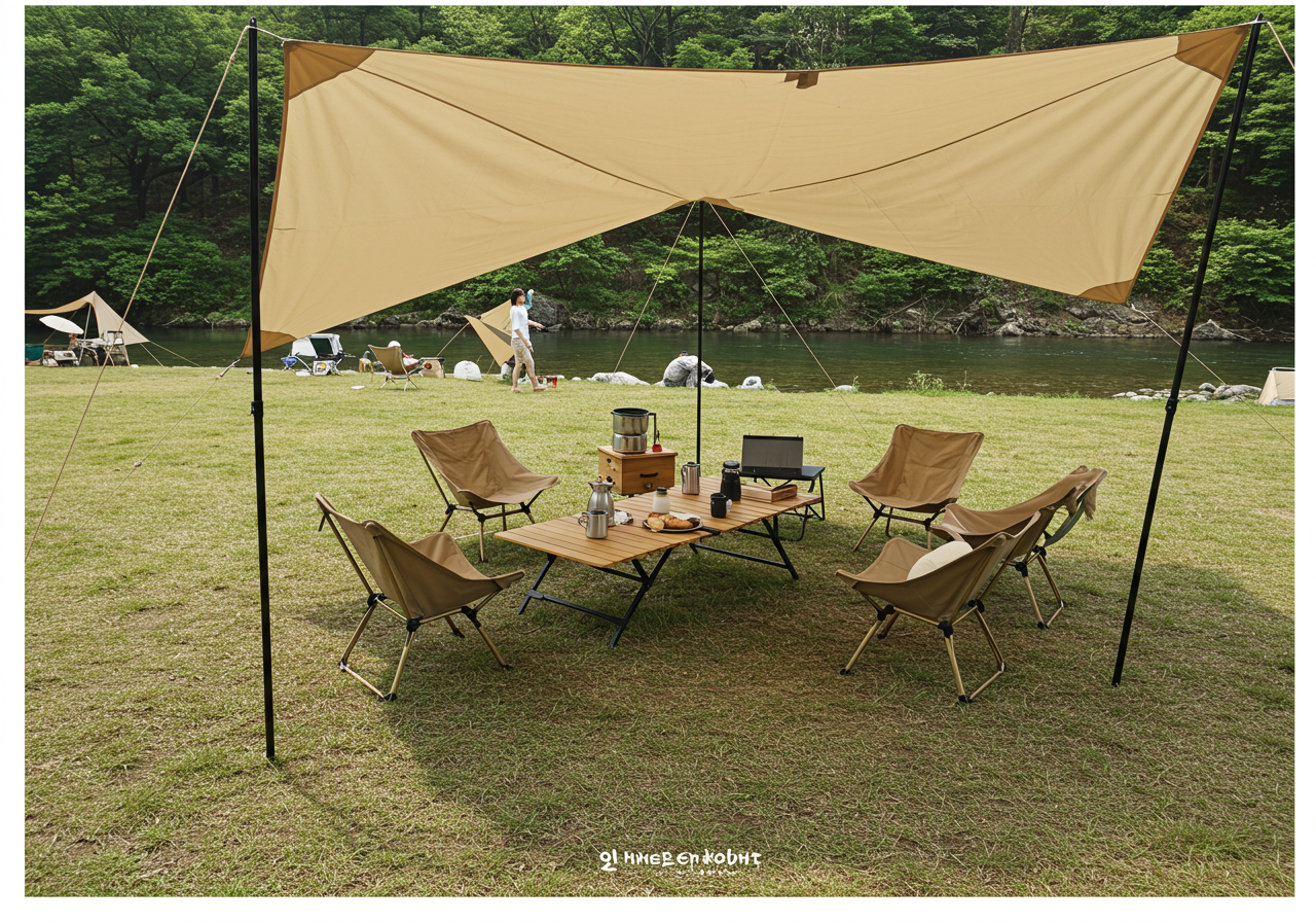 - 그늘막 & 타프: 강렬한 햇볕을 가려줄 타프 또는 그늘막은 여름 캠핑의 필수품입니다. 자외선 차단 기능이 있는 제품을 선택하고, 타프 아래에서 시원한 휴식을 즐길 수 있도록 넓은 공간을 확보하는 것이 좋습니다. 최근에는 헥사 타프나 렉타 타프 등 다양한 형태의 타프가 출시되어 있습니다.