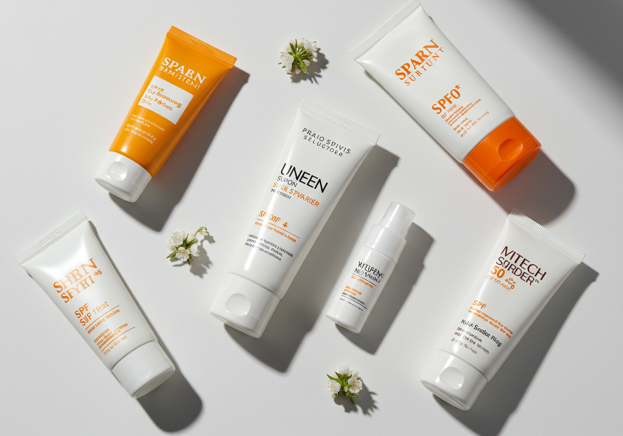 [이미지 대체 텍스트 예시] 다양한 선크림 용기들이 나란히 놓여 있고, SPF와 PA 지수 라벨이 강조되어 있다. (선크림 종류, 무기자차, 유기자차, 혼합자차)