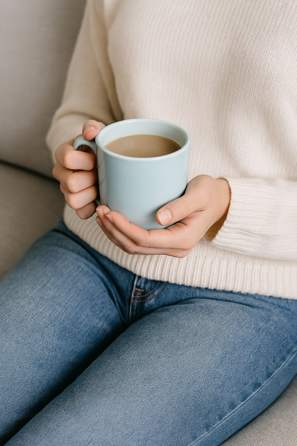 봄 햇살 아래 벤치에 앉아 따뜻한 커피 한 잔,
